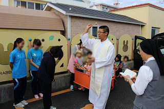 日向学院のボランティアの生徒さん、つぼみの寮の子ども達、車を運転する頻度の高い職員が集まって、「祝別式」を行いました。清めて頂いたのは、日向学院の谷口神父様です。